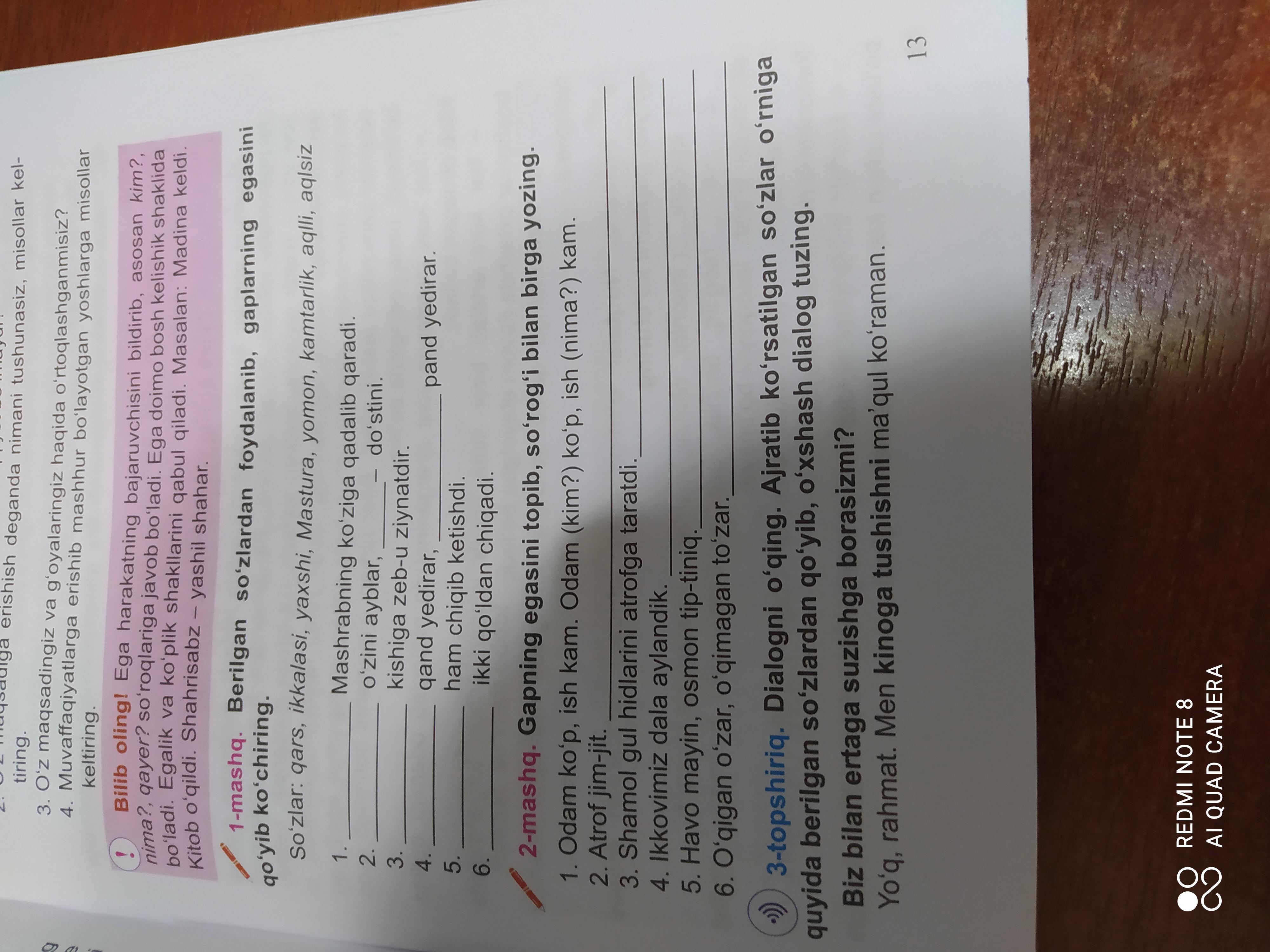 1-Odam ko'p , ish kam. Odam (kim?) ko'p, ish (nima?) kam.