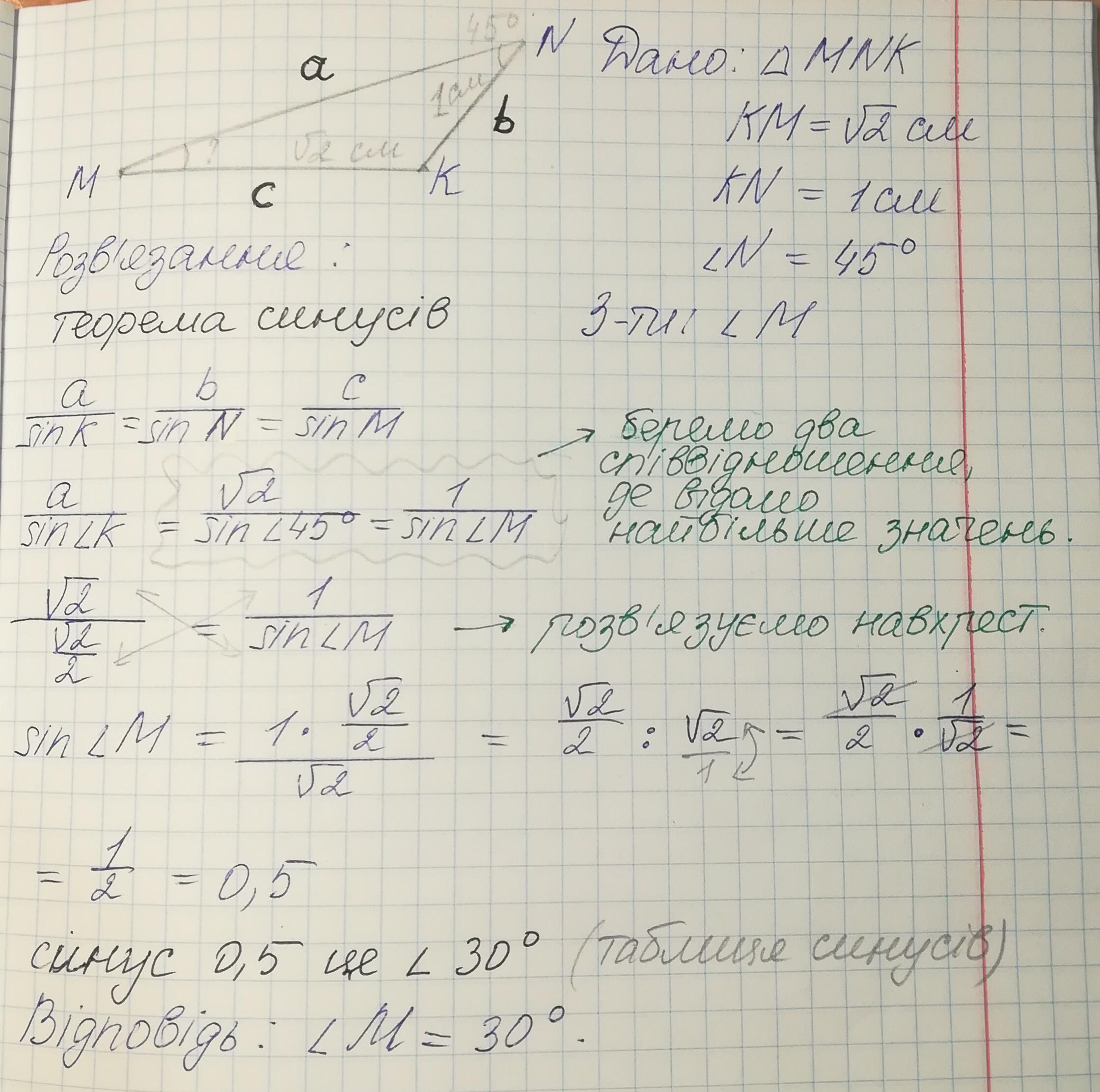 В трикутника KMN KM=корінь 2 см, KN=1см,кут N= 45 градусів. Знайдіть кут М