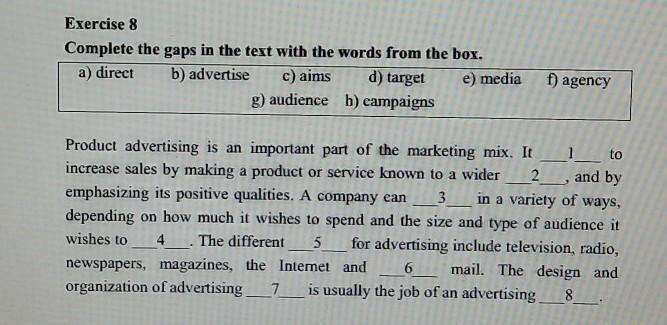 1 aims 2 audience 3 advertise 4 target 5 media 6 direct 7 campaigns 8 agency