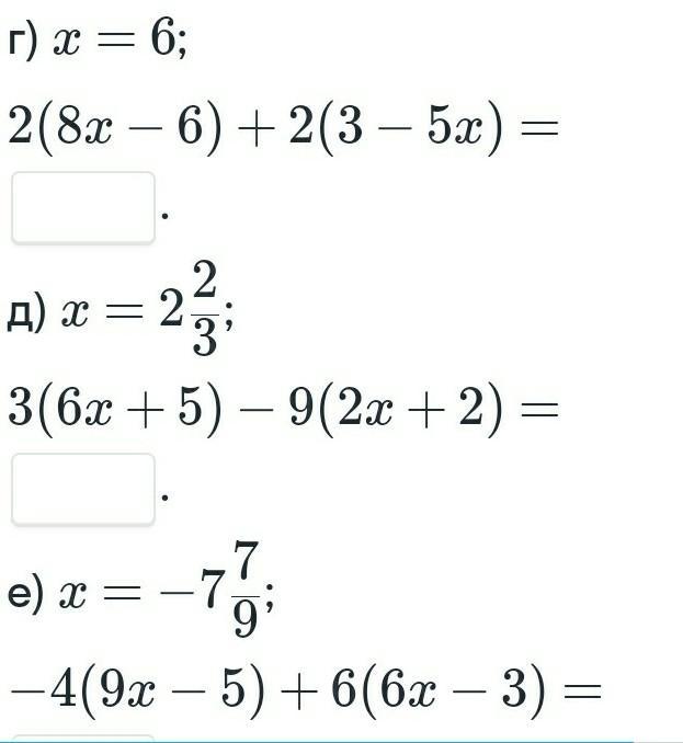 д) x=2 2/3; 3(6x+5)-9(2x+2)=3(6x+5-6x-6)=3·(-1)=-3