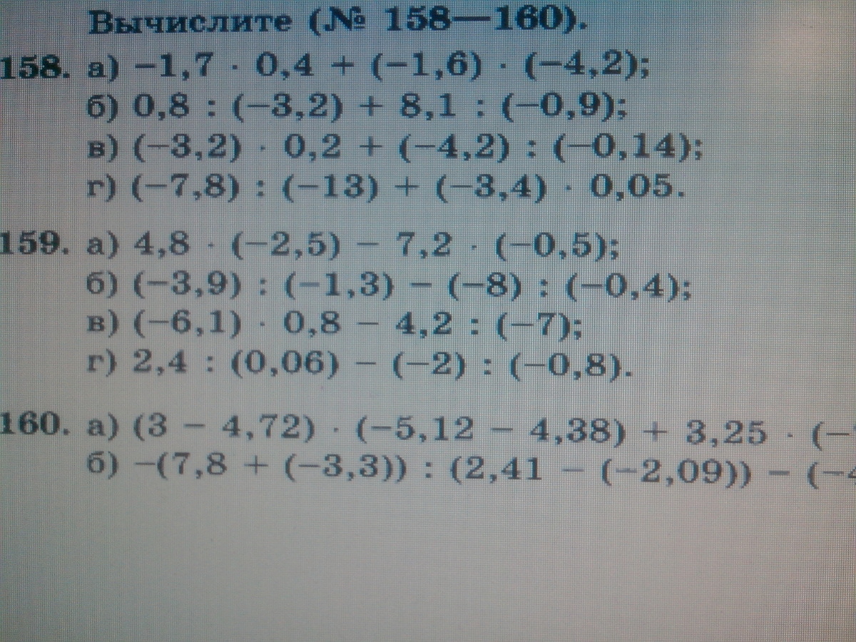 159 \  \ 1) 4,8*(-2,5)-7,2*(-0,5)=-12+3,6=-8,4 \  \ 2)(-3,9):(-1,3)-(-8):(-0.4)=3-20=-17 \  \ 3) (-6.1)*0.8-4.2:(-7)=-7.625+0.6=-7.025 \  \ 4)2.4:(0.06)-(-2):(-0.8)=40-2.5=37.5
