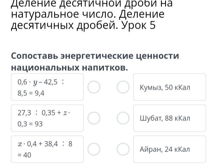 Деление десятичной дроби на натуральное число. Деление десятичных дробей. Урок 5 Сопоставь энергитические ценности национальных напитков