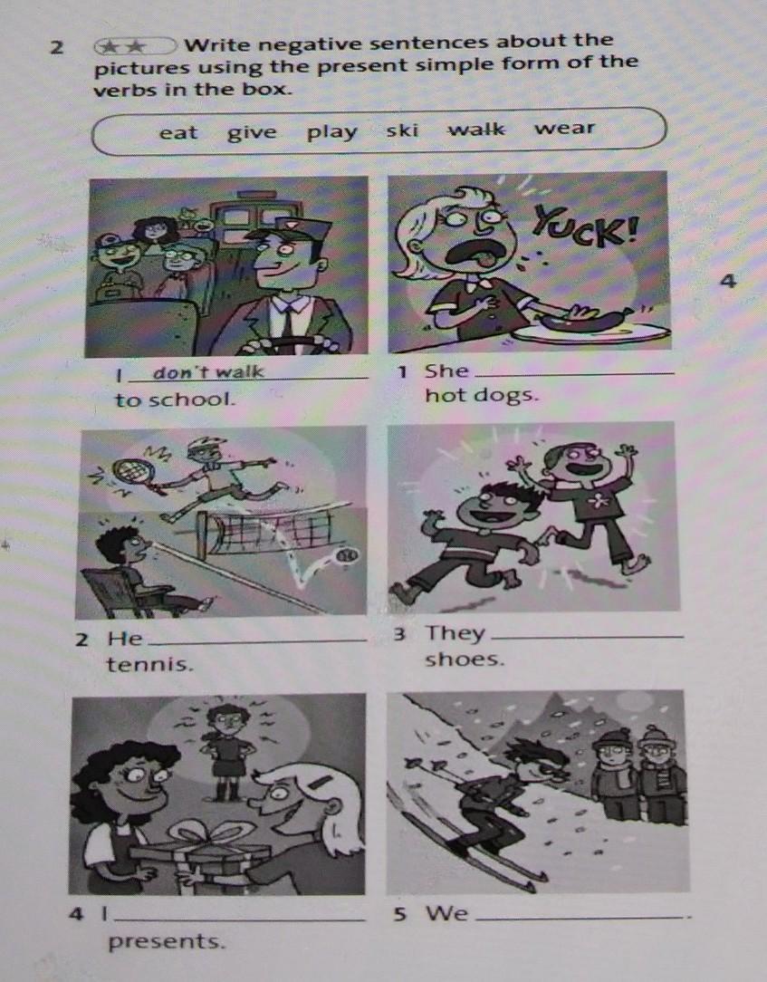 Write negative sentences about the pictures using the present simple form of the verbs in the box.