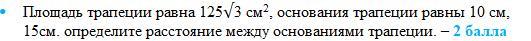 Площадь трапеции равна 125√3 см2, основания трапеции равны 10 см, 15см. определите расстояние между основаниями трапеции