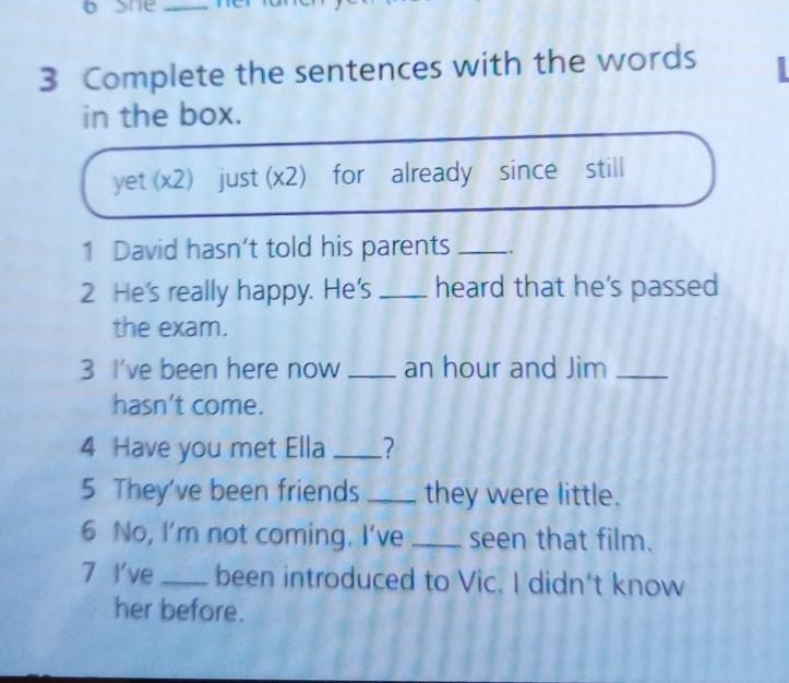 1 yet 2 just 3 for/still 4 yet 5 since 6 already 7just