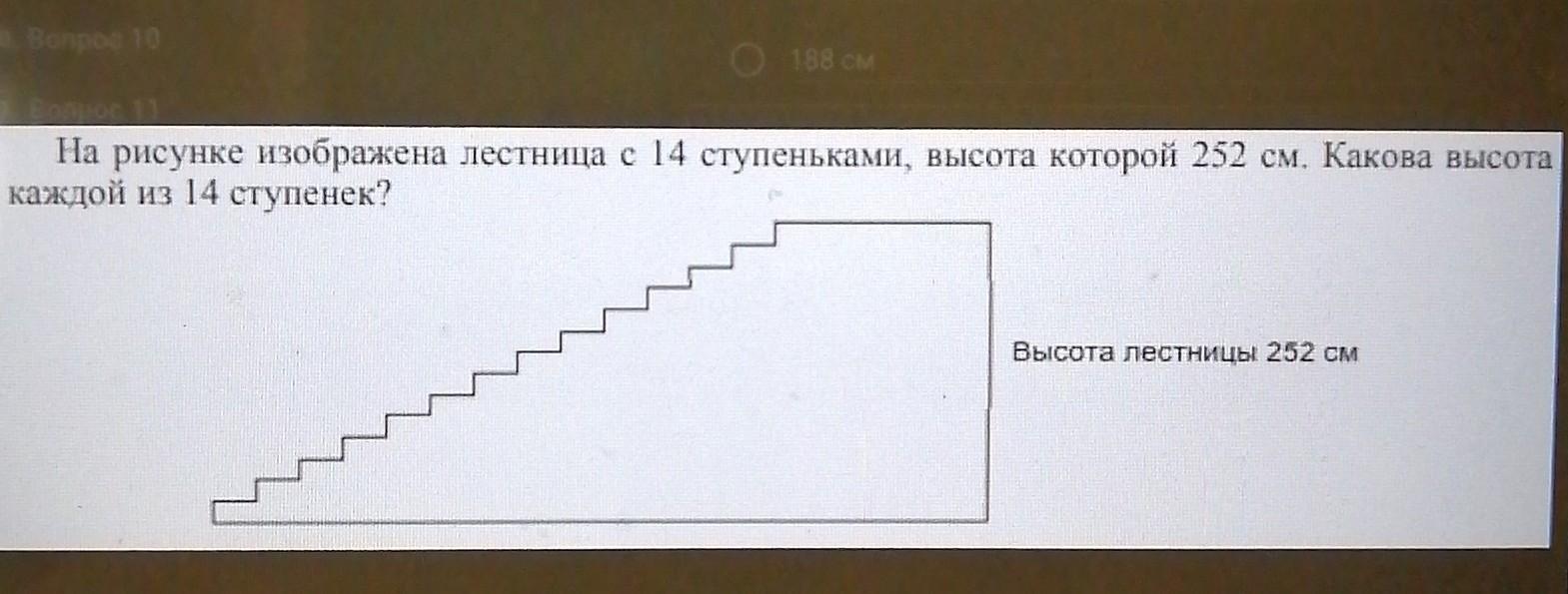 На рисунке изображена лестница с 14 ступеньками, высота которой 252 см. Какова высота