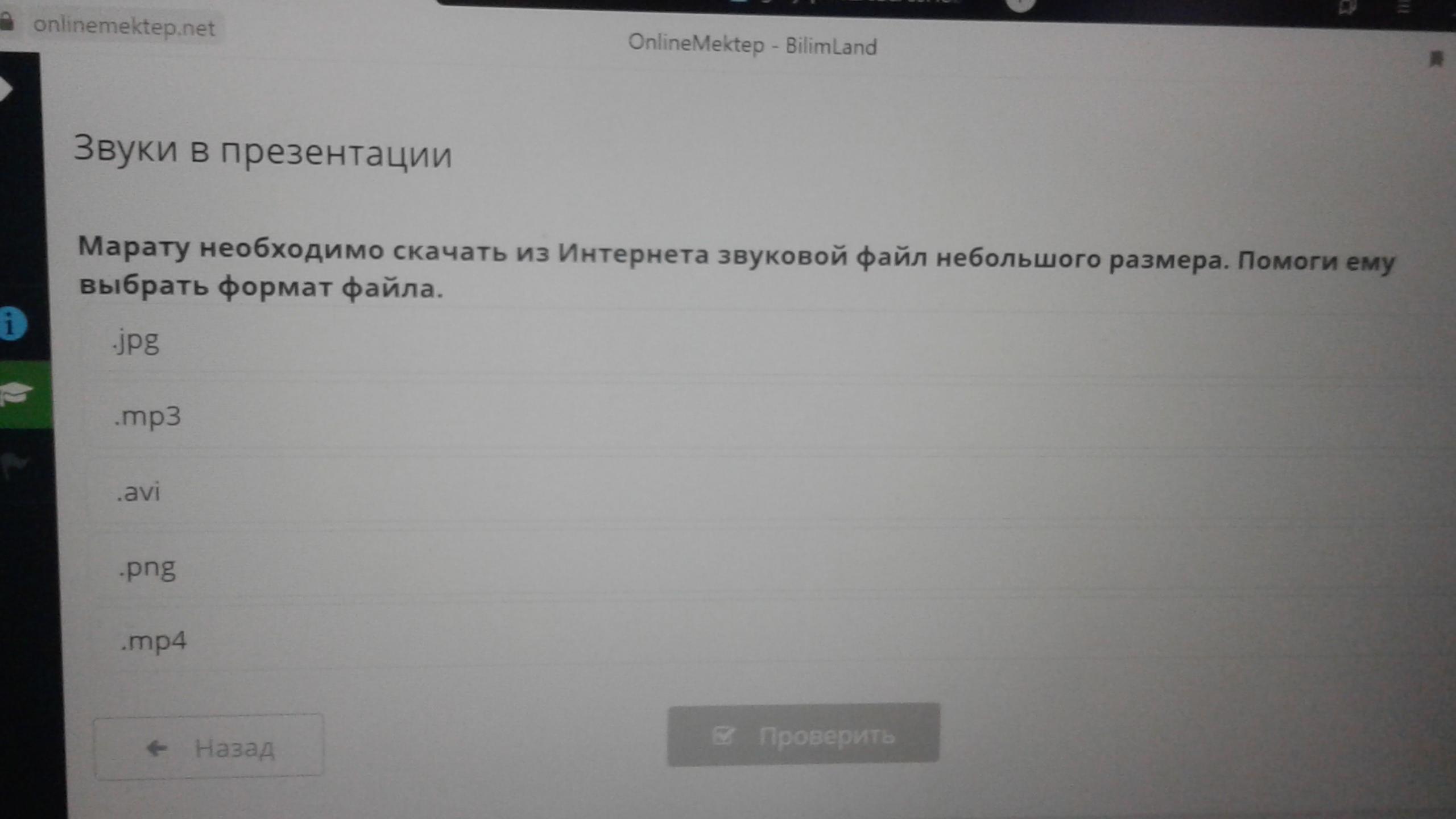 Марат необходимо скачать из Интернета звуковой файл небольшого размера.Помогите ему выбрать формат файла.Помогите пожалуйста даю 10 баллов.Онлайн мектеп