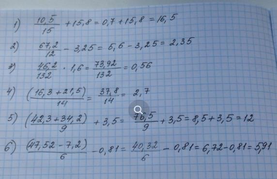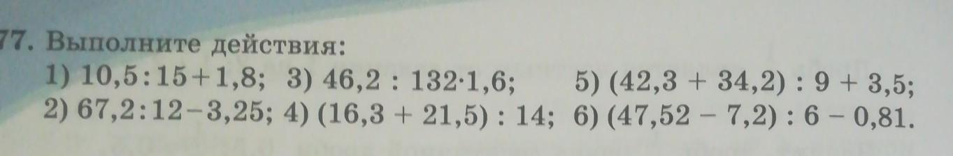 1) 10,5:15+1,8; 3) 46,2 : 132-1,6; 5) (42,3 + 34,2): 9+3,3