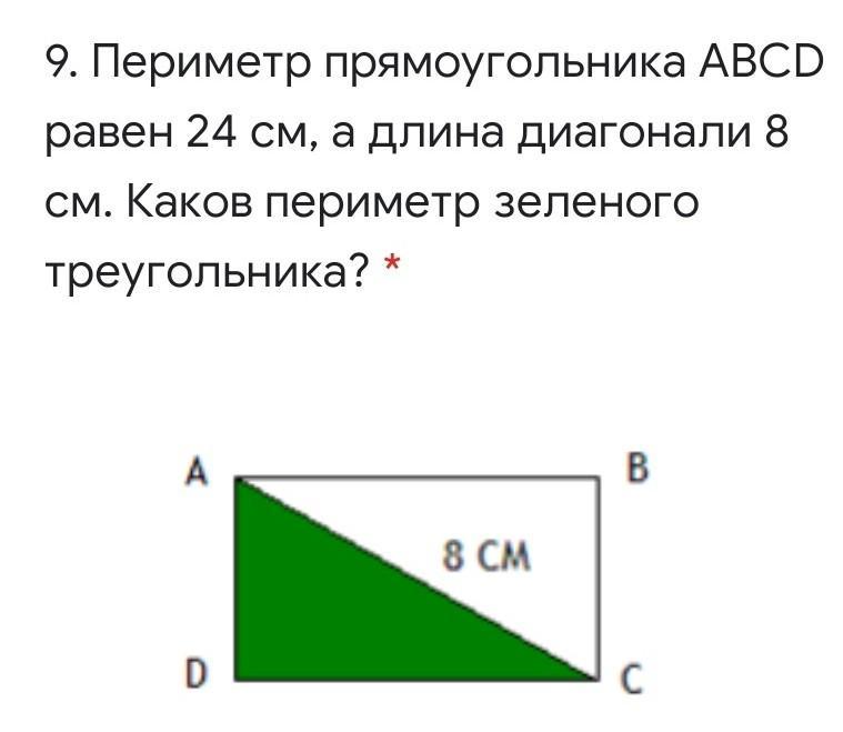 Периметр прямоугольника ABCD равен 24 см, а длина диагонали 8 см. Каков периметр зеленого треугольника?