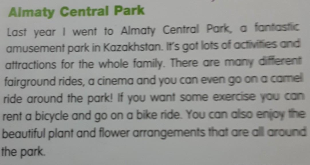 Nouns: year, Almaty Central Park, Amusement park, Kazakhstan, activities, attractions, family, rides, cinema, even, camel, ride, park, exercise, bicycle, bike, ride, arrangements.