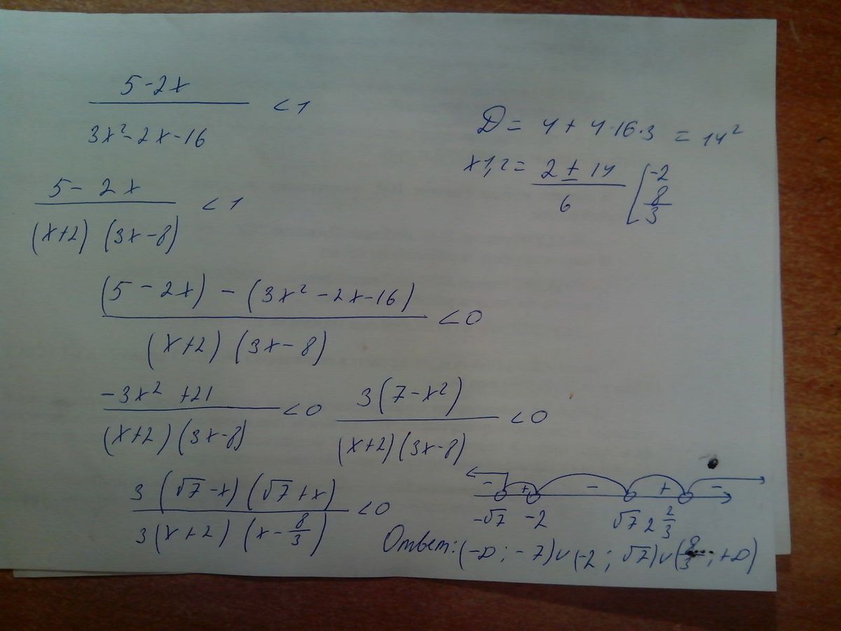 (x-sgrt7)(x+sgrt7)/(x+2)(x-8/3)>0.Решим методом интервалов .Сравним значения выражений x=-8/3 и х=-sgrt7. Для этого возведем оба в квадрат 64|/9>7 следовательно -8/3