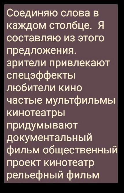 Соединяю слова в каждом столбце. Я составляю из этого предложения. зрители привлекать спецэффекты любители кино знакомства мультфильмы кинотеатры изобрести документальный фильм публика проектировать кино рельефный фильм