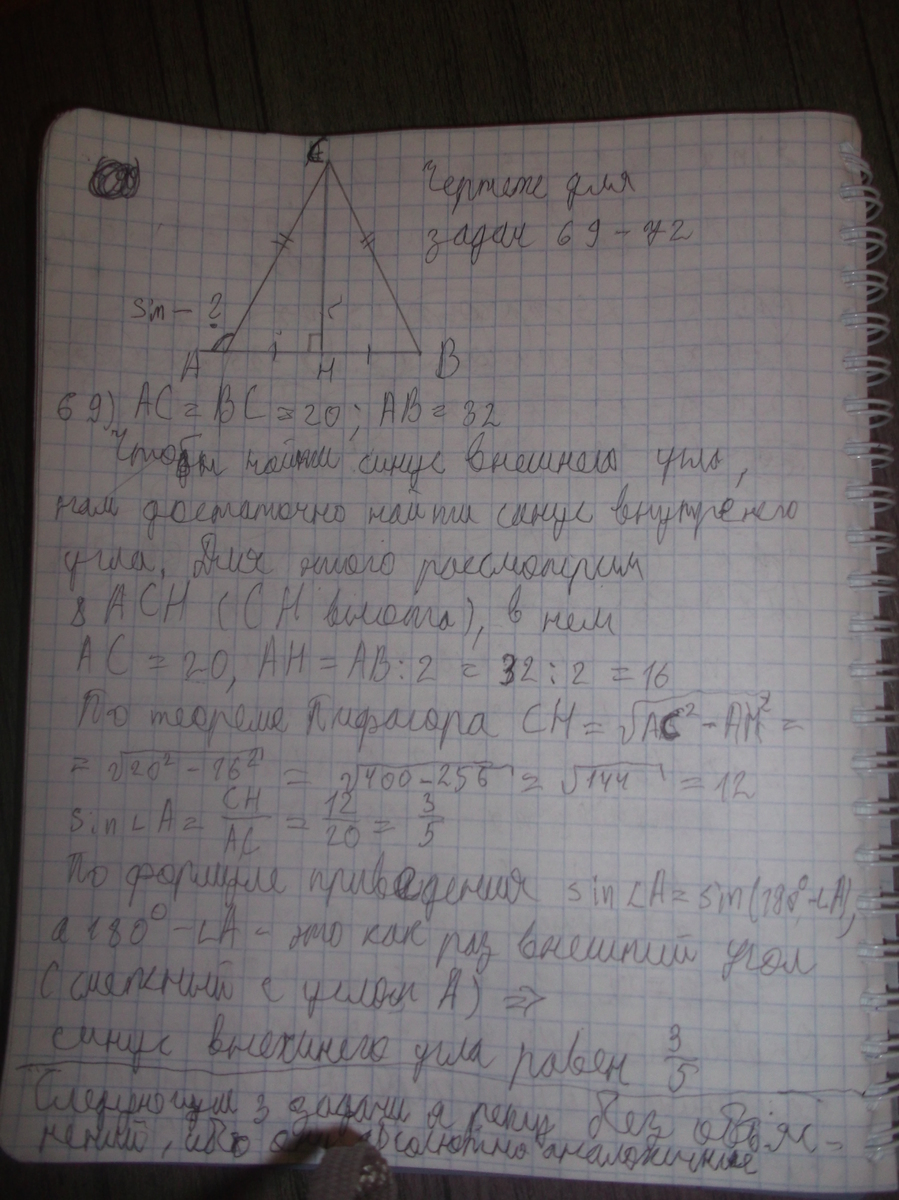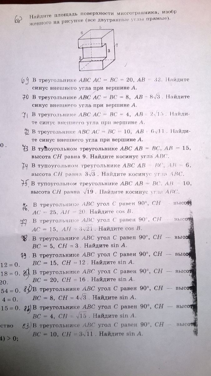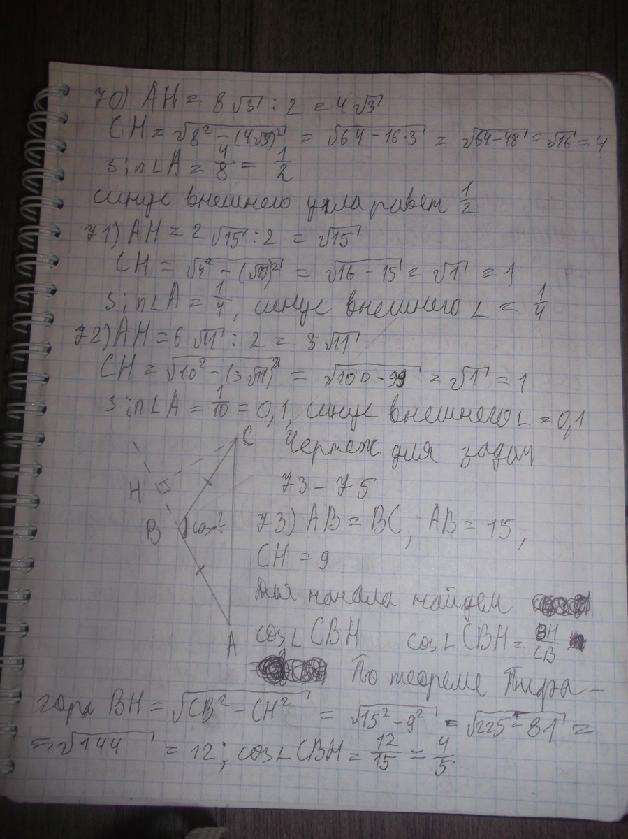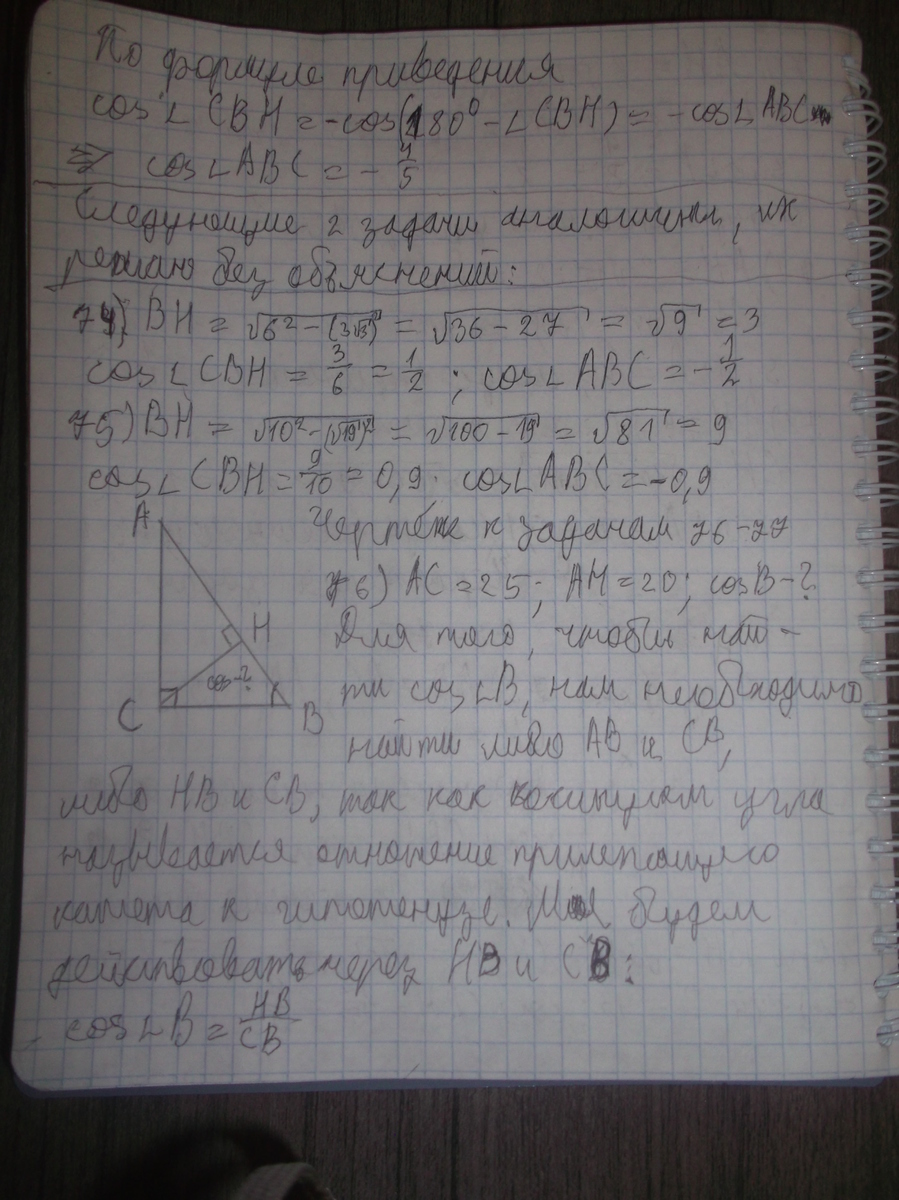 для задач 73 -- 75 угол АВС будет внешним для угла СВН из прямоугольного треугольника CНВ, где СН -- высота