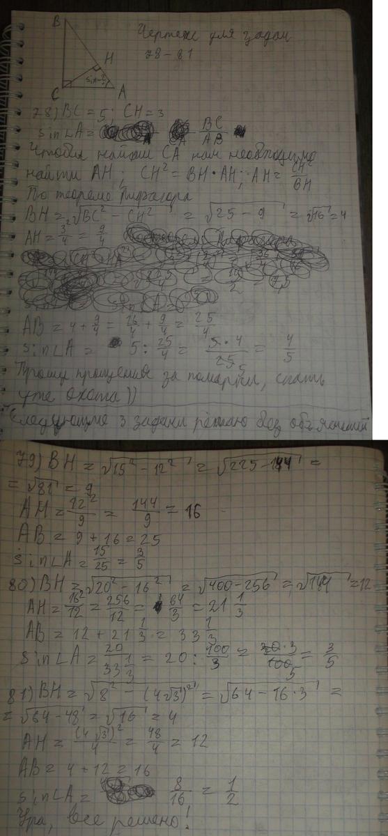 в оставшихся задачах вновь задано отношение для косинуса, нужно найти синус... sin(A) = CB/AB = HB / BC _____ cos(A) = CA / AB = CH / BC