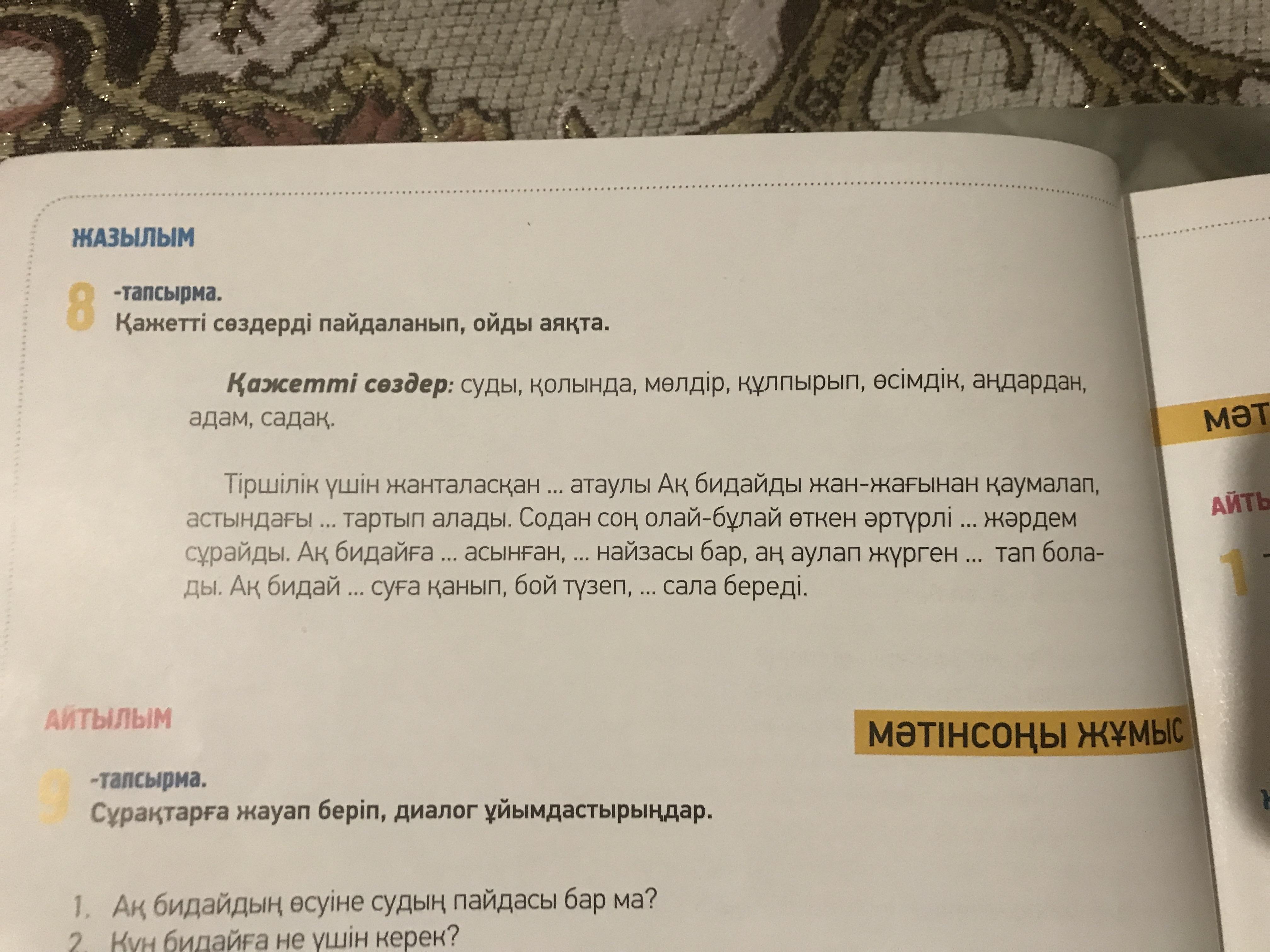 Тіршілік үшін жанталасқан өсімдік атаулы Ақ бидайды жан-жағынан қаумалап, астындағы суды тартып алады. Содан соң олай-бұлай өткен әртүрлі аңдардан жәрдем сұрайды. Ақ бидайға садақ асынған, қолында найзасы бар, аң аулап жүрген адам тап болады. Ақ бидай мөлдір суға қанып, бой түзеп, құлпырып сала береді.