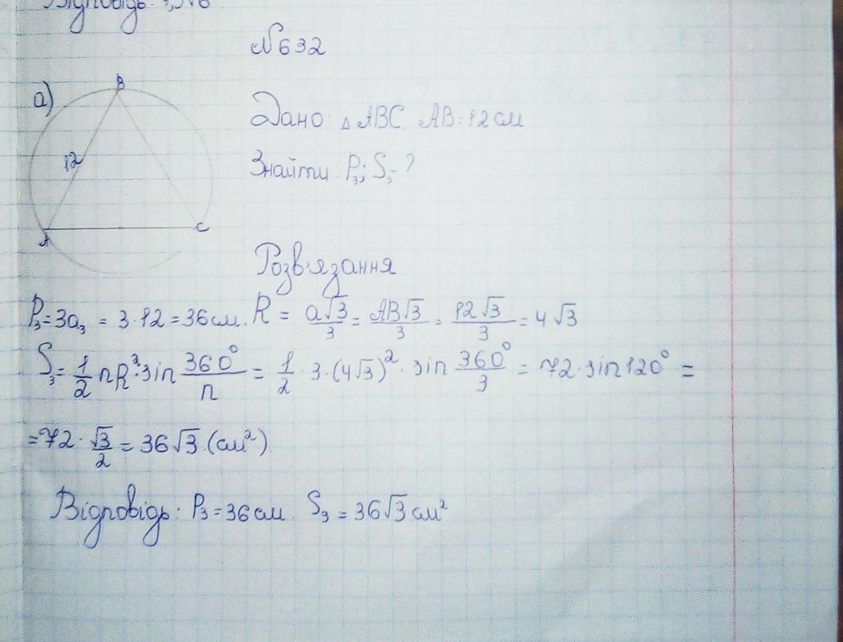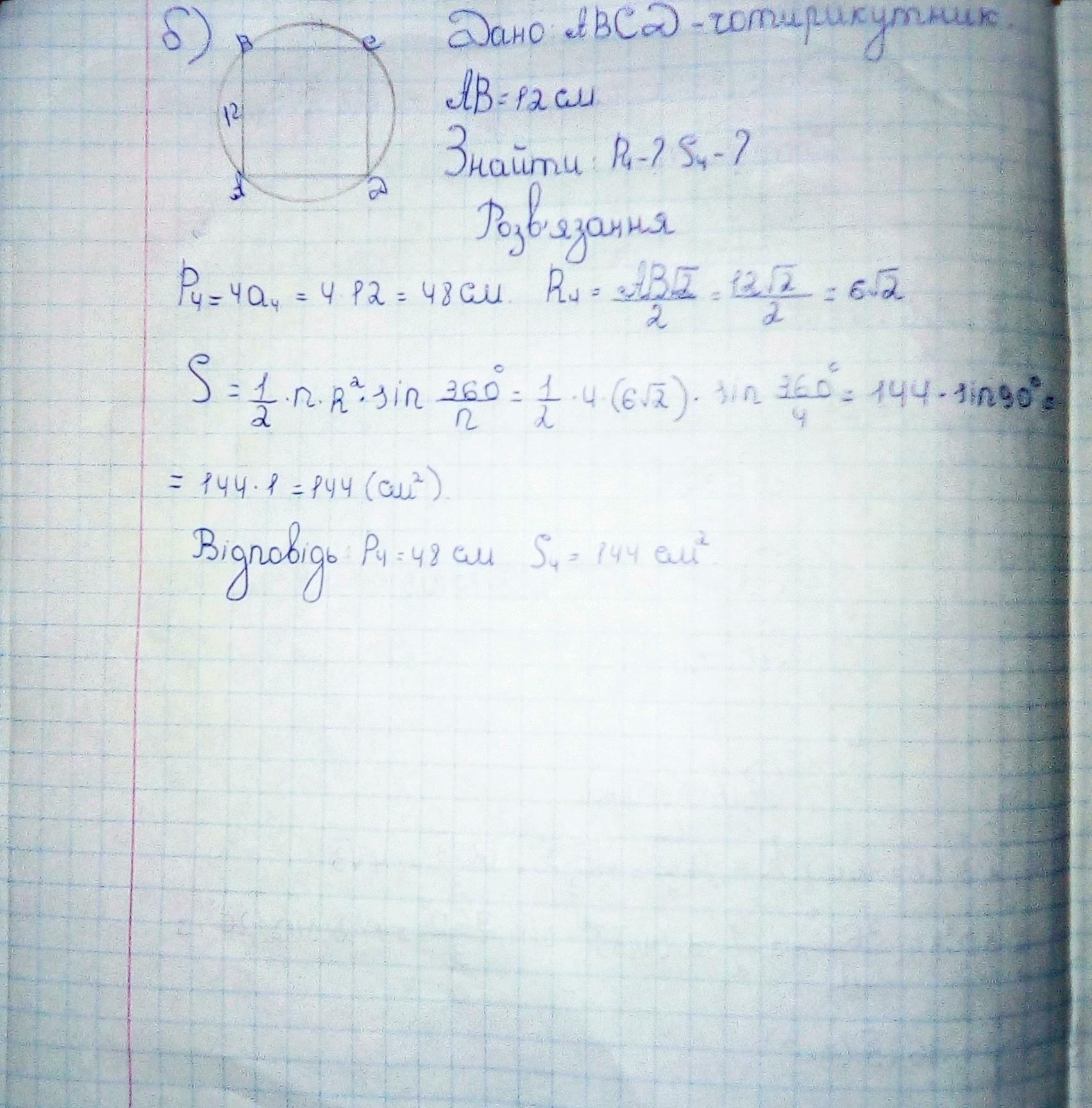 Сторона правильного многокутника, вписаного в коло, дорівнює 12 см. Знайдіть периметр і площу цього многокутника, якщо :