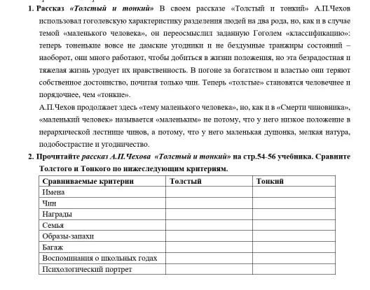 1) Толстый-Миша(упоминали как Мишей) Тонкий-Порфирий 2)Толстый-тайный советник, Тонкий-чин коллежского асессора 3)Тонкий-российский орден Станислава,3-степени,Толстый-два ордена-звезды:святого Станислава и святой Анны 4)Тонкий- сын Нафанаил ,жена Луиза Ванценбах,Толстый- без семья 5)Толстый- не помню(вроде одна только сумка) Тонкий-навьючен багажом 6)Толстый-губы были подёрнуты маслом ,от него пахло флер-д'оранжем,Тонкий-пахло ветчинной и кофейной гущей 8)Толстый-в школе раньше называли Геростратом-потому ,что он папиросой прожёг книгу,Тонкий-называли Эфиальтом-любил ябедничать 9)Толстый-ведёт себя спокойно,ни к чему не придерается,Тонкий-думает что Толстый будет завидовать ему