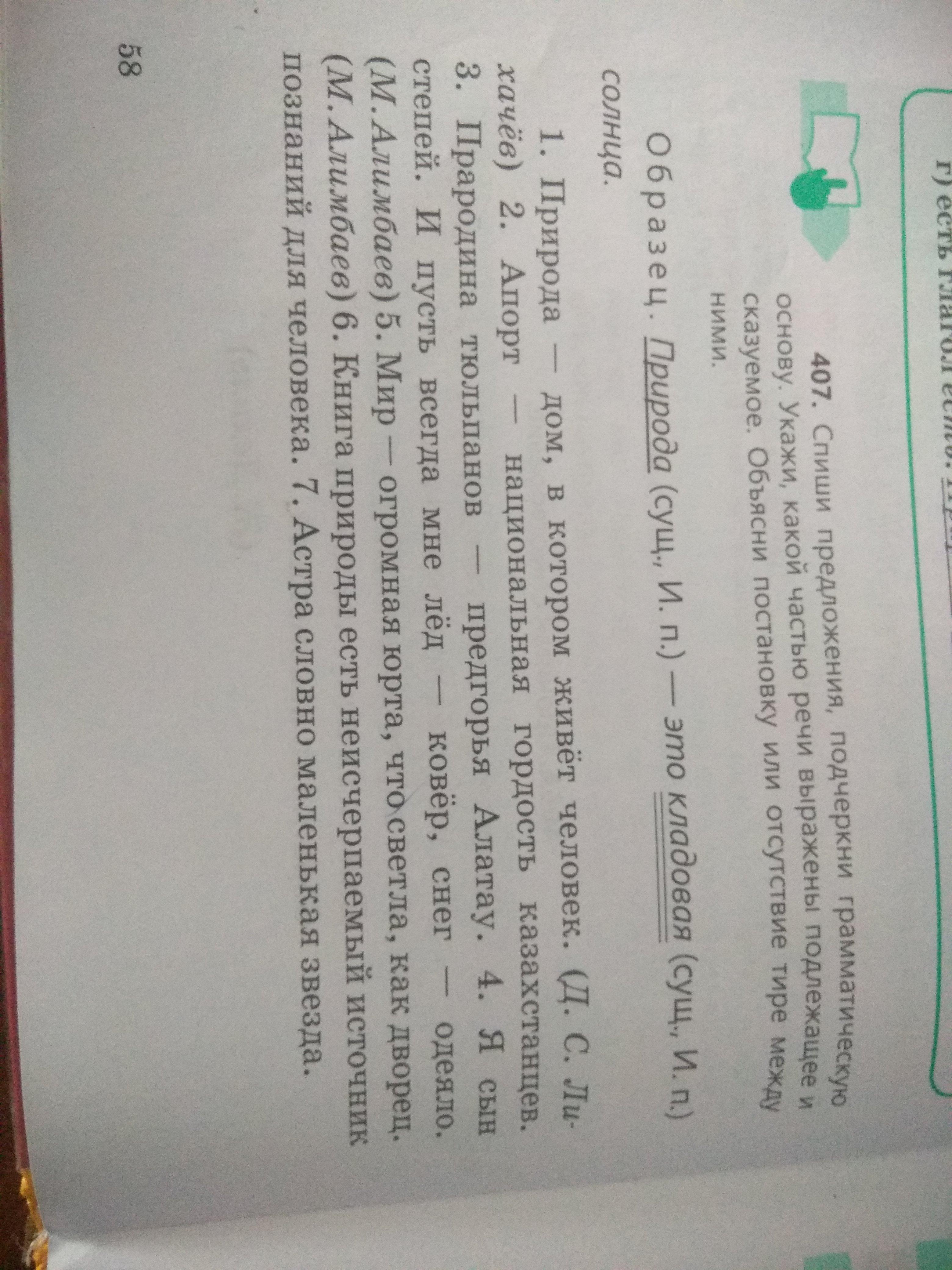 №407 Спиши предложения, подчеркни грамматическую основу. Укажи, какой частью речи выражены подлежащее и сказуемое. Объясни постановку или отсутствие тире между ними.