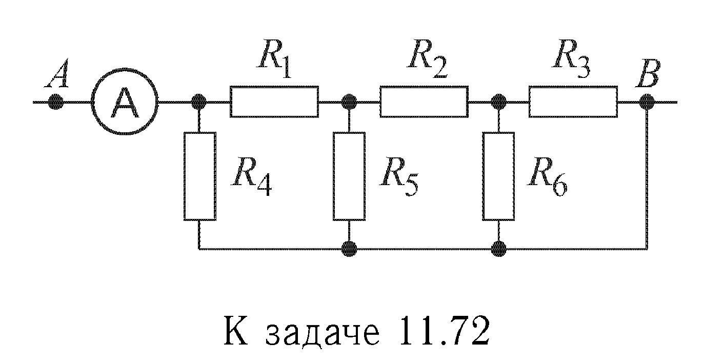 рисунке 11.72. Сопротивление резисторов: R1 = 1,6 Ом, R2 = 3,0 Ом, R3 == R6 = 2,О Ом, R4 = 1,0 Ом, R5 = 6,О Ом. Напряжение UАВ = 2,О В. Определить общее сопротивление цепи, силу тока в резисторах R1 и R4, падение напряжения на резисторе R5.(0,8 Ом; 0,5 А; 2 А; 1,2 В
