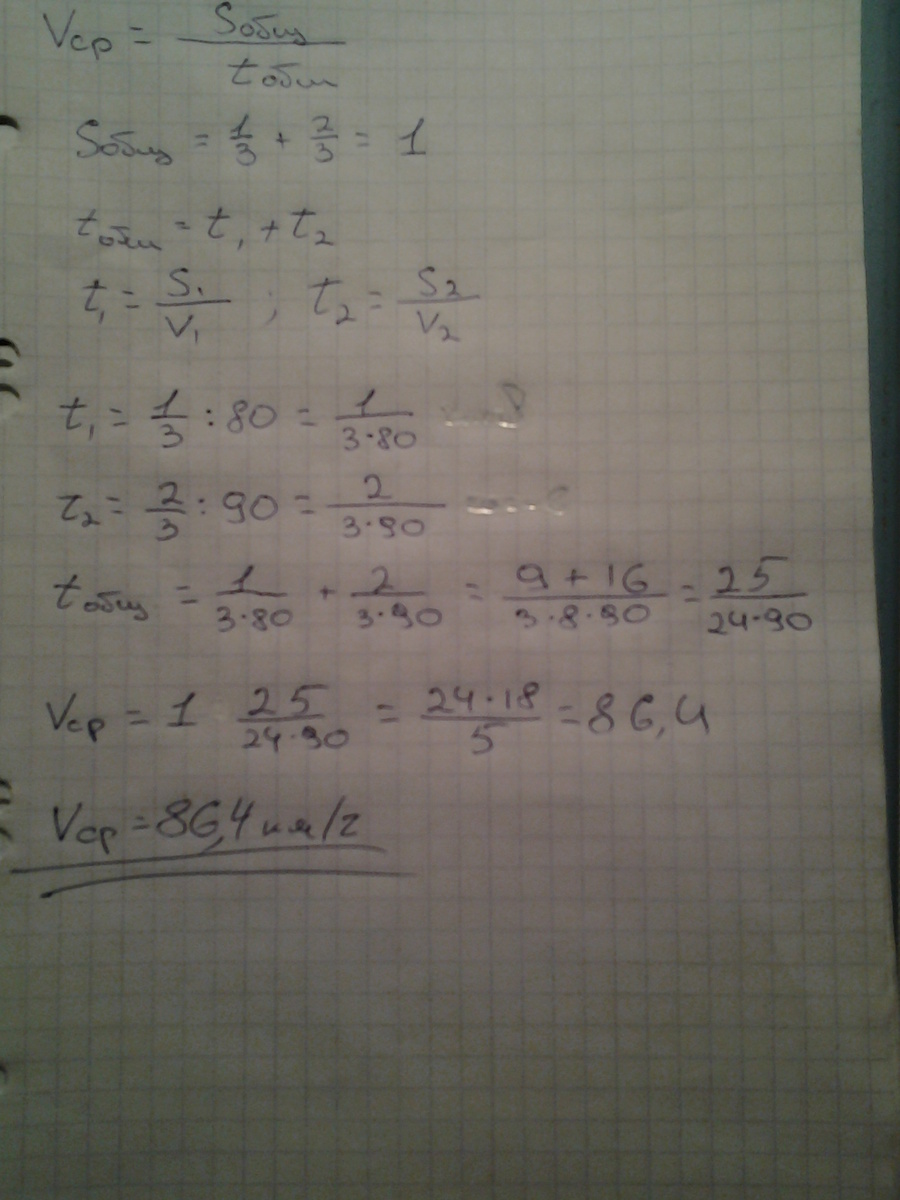 первую треть пути автомобиль ехал со скоростью 80 км/ч , а остальной путь - со скоростью 90 км/ч . надйите среднюю скорость автомобиля