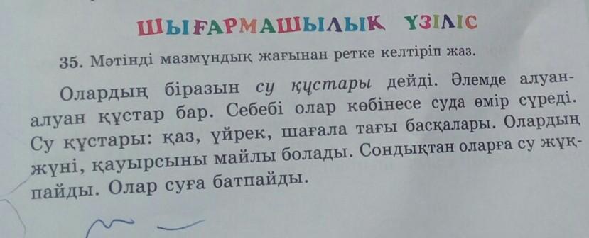 Әлемде алуан-алуан құстар бар.Олардың біразын су құстары дейді.Себебі олар көбінесе суда өмір сүреді.Су құстары:қаз,үйрек,шағала тағы басқалары.Олар суға батпайды.Олардың жүні,қауырсыны майлы болады.Сондықтан оларға су жұқпайды.