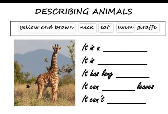 1 It is a giraffe. it is yellow and brown. it has got a long neck. it can eat leaves. it cant swim. если про своего it is a pet. it is small. it has got 4 legs, 2 ears, a long tail, whiskers and a soft fur. it can jump, climb the trees. it cant swim. it likes milk, fish and meat ( it is a cat)