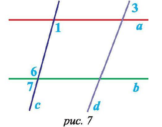 Даны прямые a, b, c и d. Найдите ∠6, если ∠1=103°, ∠7=77°, ∠3=65°(рис.7). Определите взаимодействие прямы a, b, c и d.