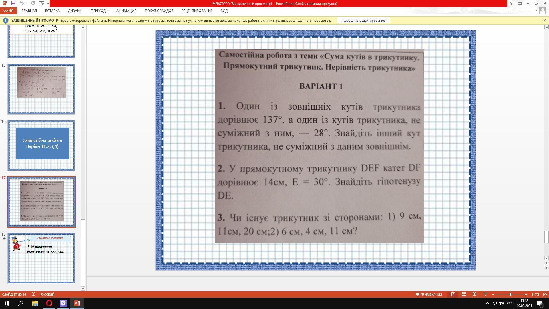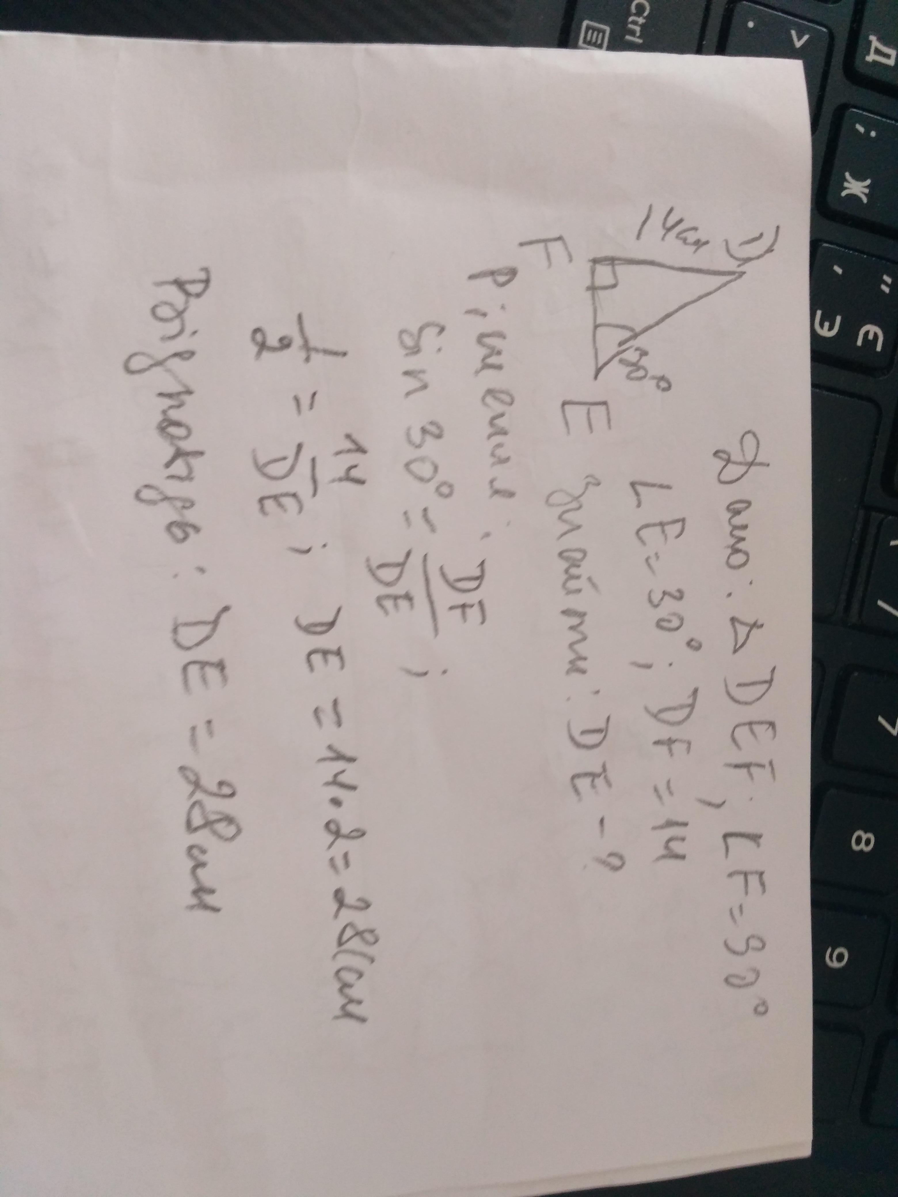 2. дивись в файлі Або як варіант Напиши, що сторона DF лежить проти кута в 30°, Отже гіпотенуза буде вдічі більша . Тому DE=28 см