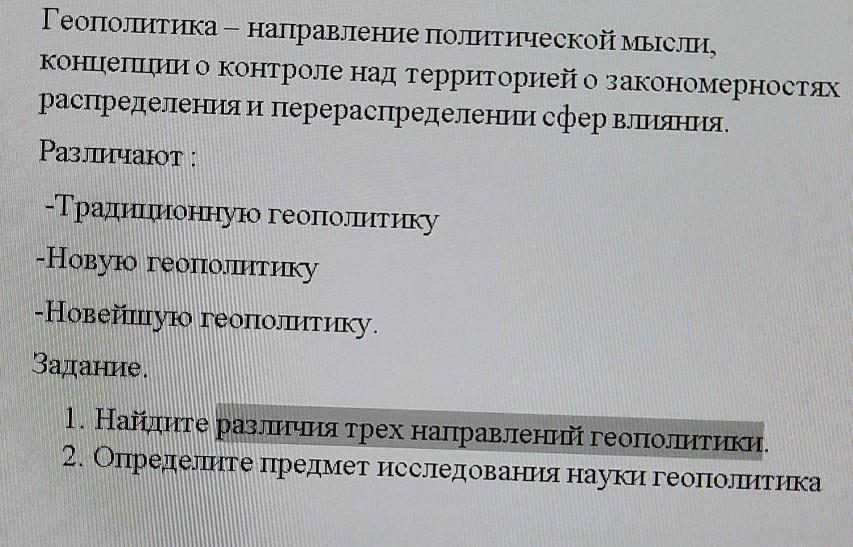 1) Традиционная геополитика делает акцент на военно-политическую мощь государства. Геоэкономика (новая геополитика) делает акцент на экономической мощи государства. Новейшая геополитика делает акцент на силе духа над военной и экономической мощью, также определяет поведение государств в международных отношениях.