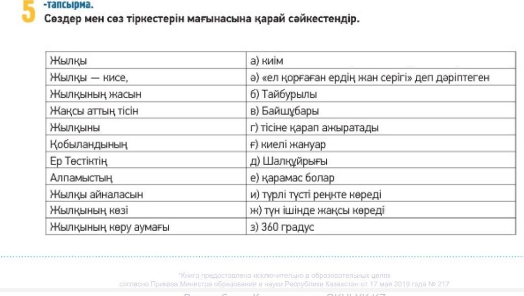 57-бет.5-тапсырма. Сөздер мен сөз тіркестерін мағынасына қарай сәйкестендір.