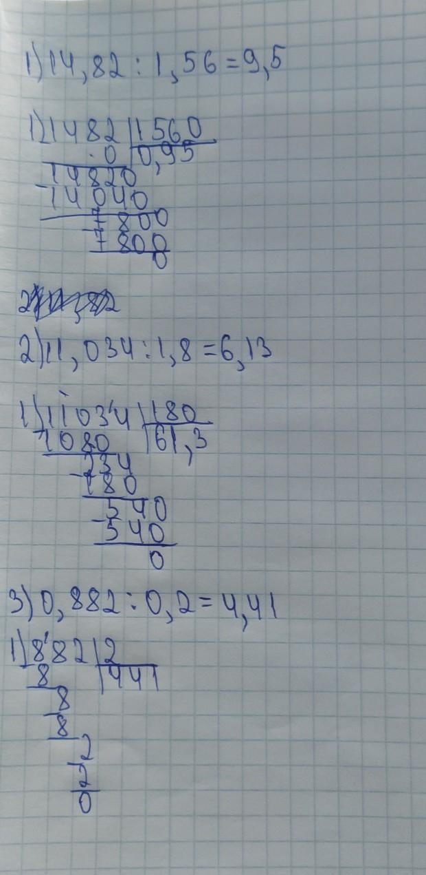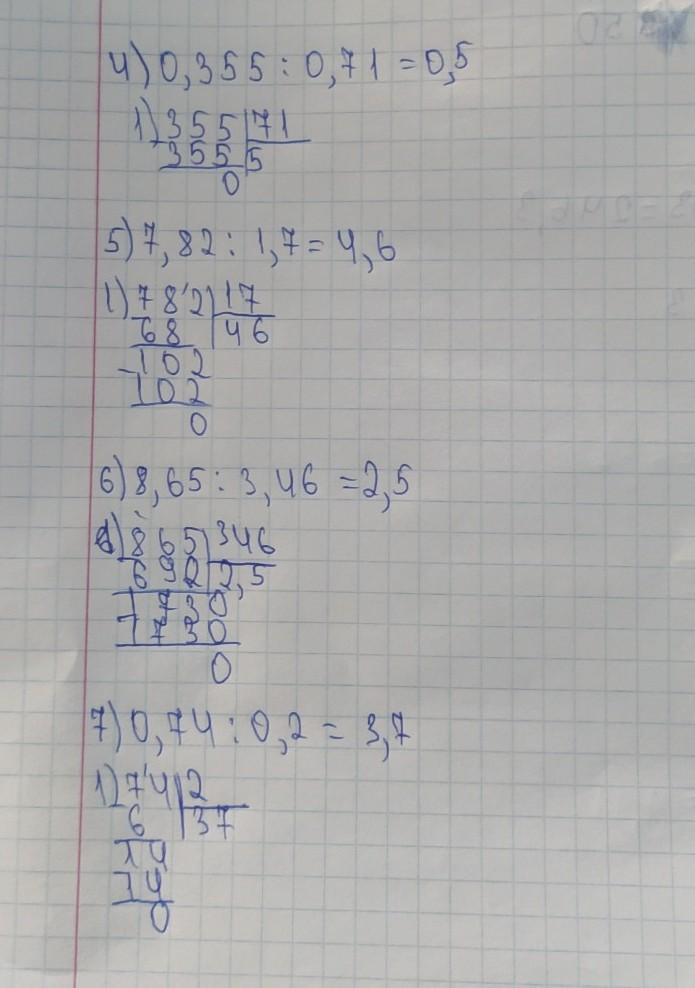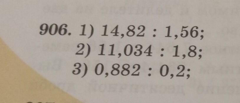906. 1) 14,82 : 1,56; 2) 11,034 : 1,8; 3) 0,882 : 0,2; 4) 0,355: 0,71; 5) 7,82: 1,7; 6) 8,65 : 3,46;B 7) 0,74 : 0,2;B 8) 3,5 : 0,07; 9)7,389: 0,03. там на картинке не все но я написал и можете написать РЕШЕНИЕ!