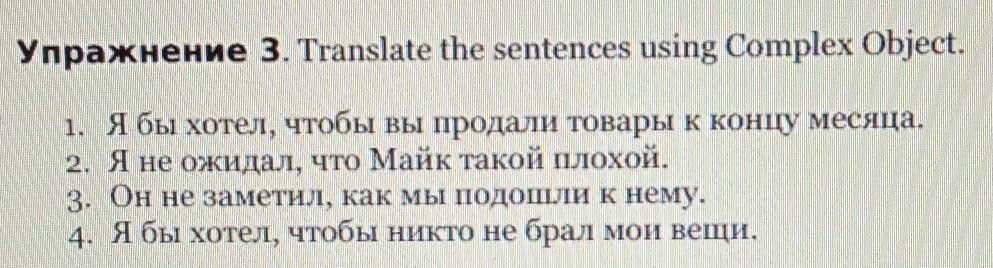 1. I would like you to sell items by the end of the month. 2. I didn't expect Mike to be so bad. 3. He did not notice how we approached him. 4. I would like no one to take my things.