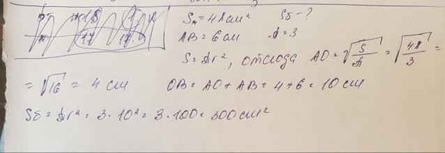 Даны два Круга с общим центром O. Площадь меньшего Круга равна 48 см2 . отрезок AB равен 6 см значение числа Пи= 3 .Определите площадь кольца красного цвета