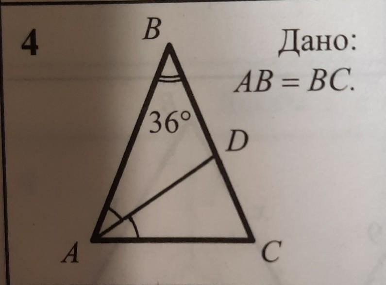 Объяснение: 1. Угол b равен углу DAC т.к это р/б треугольник и можно найти углы A и C (180-36=144, делим на 2 так как углы равны, равняется 72). AD- биссектриса и делит угл A на 2 (72/2=36, значит BAD и DAC=36)