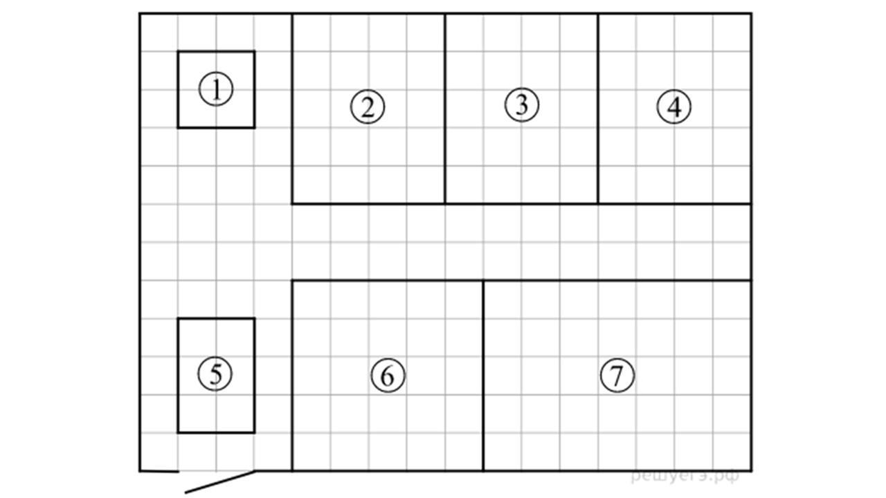 Владимир купил участок, чтобы заняться фермерством. План его фермы изображен на рисунке, сторона каждой клетки равна 2 м. Ферму планируется обнести забором. Вход будет осуществляться через единственные ворота. Прямо перед воротами предполагается построить жилой дом. За ним будет построен гараж с отдельным въездом. Наибольшее поле будет отведено под посев картофеля. На поле рядом с ним планируется посадить кукурузу. Поле, обозначенное на плане цифрой 3, планируется засеять морковью. Поле, ближайшее к гаражу, планируется отвести под капусту. Оставшееся поле будет засеяно репой. Пустое пространство между полями планируется засыпать гравием. Чтобы засыпать 4 м2 гравием, требуется 0,2 м3 материала. Также Владимир планирует купить трактор для хозяйственных нужд.