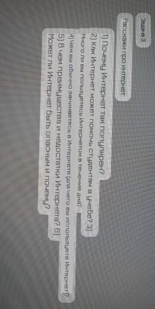 Интернет популярен разными мессенджерами. Студенты могут получать информацию из интернета, а также помогать в составлении презентаций. Я пользуюсь интернетом в пользе учёбы, а также и в своих целях. Недостатки интернета в том, что некоторые люди не могут без него. Преимущества интернета в том что можно узнать информацию за быстрое время. Интернет может быть опасен. К нему у многих людей есть зависимость.