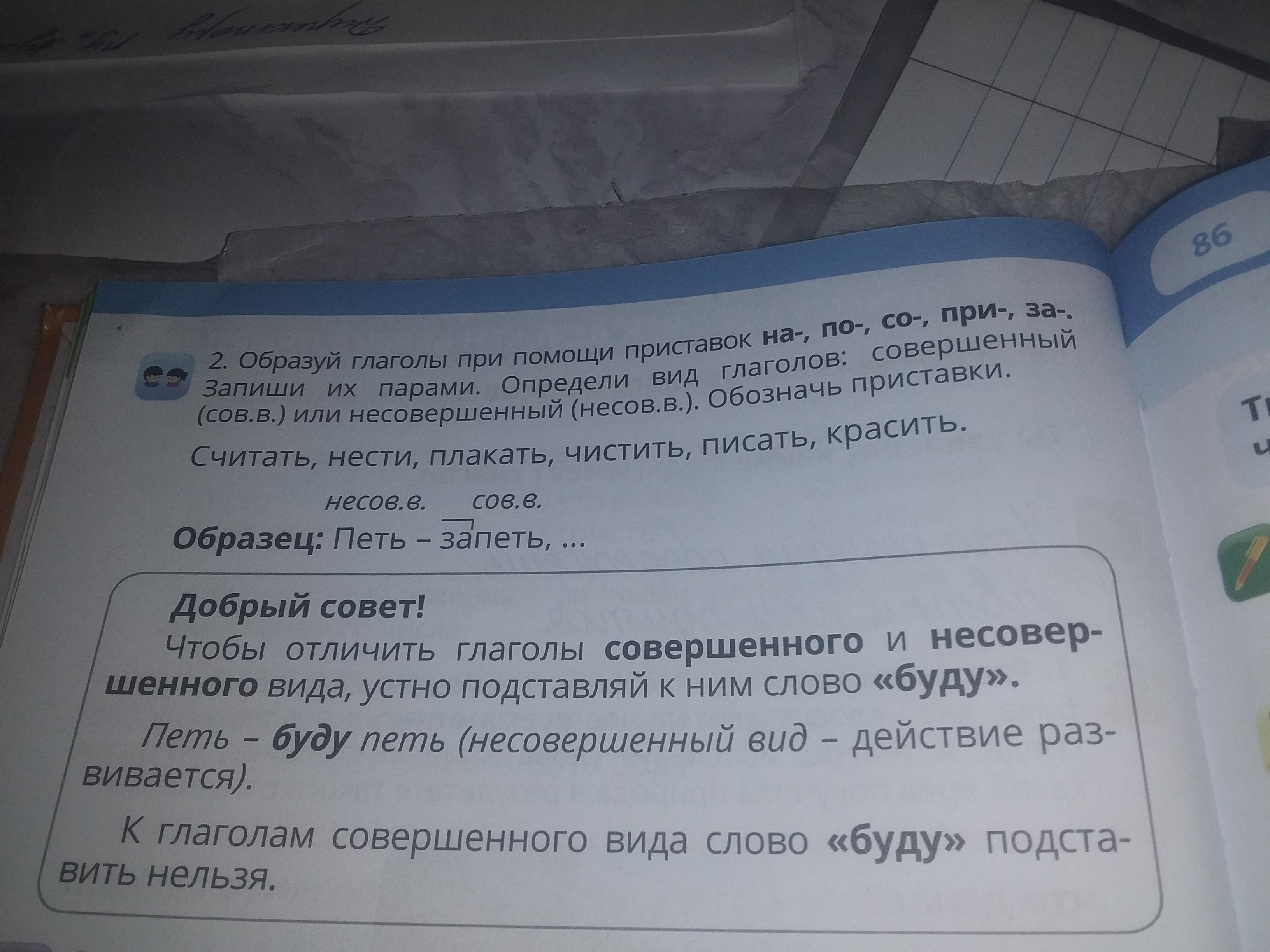 считать (несов.в) - сосчитать (сов.в) приставка со; нести(несов.в) - принести(сов.в) приставка при; плакать(несов.в) - заплакать(сов.в) приставка за; чистить(несов.в) - почистить(сов.в) приставка по; писать(несов.в)- записать(сов.в) приставка за; красить (несов.в) - покрасить(сов.в) приставка по