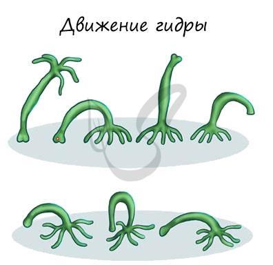 Для кишечнополостных характерны различные способы передвижения. Например, пресноводная гидра(гидроидные) может передвигаться «шагающими» движениями — изогнув тело и прикрепившись к субстрату щупальцами, она подтягивает подошву к переднему концу тела. Так же для гидры характерны «кувырки» — поочередное прикрепление к субстрату щупальцами и подошвой (рисунок ). Актинии (коралловые полипы) медленно передвигаются за счет сокращения и расслабления подошвы. Для медуз (сцифоидные) характерно «реактивное» движение — они с силой выталкивают воду из-под купола.