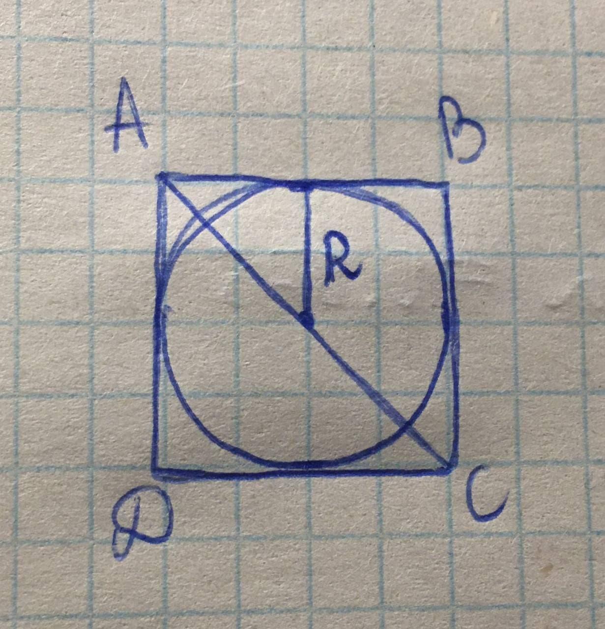 Найти нужно диагональ квадрата, обозначим ее d. Известно, что радиус окружности R равен 55.