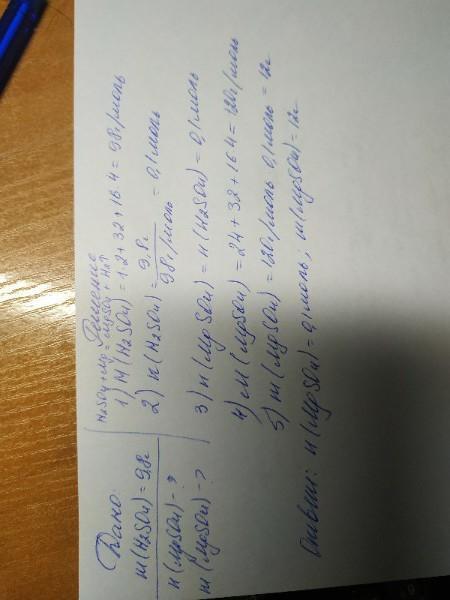 серная кислота массой 9.8 г. вступила в реакцию с магнием. определите масса и химическое количество образовавшейся соли