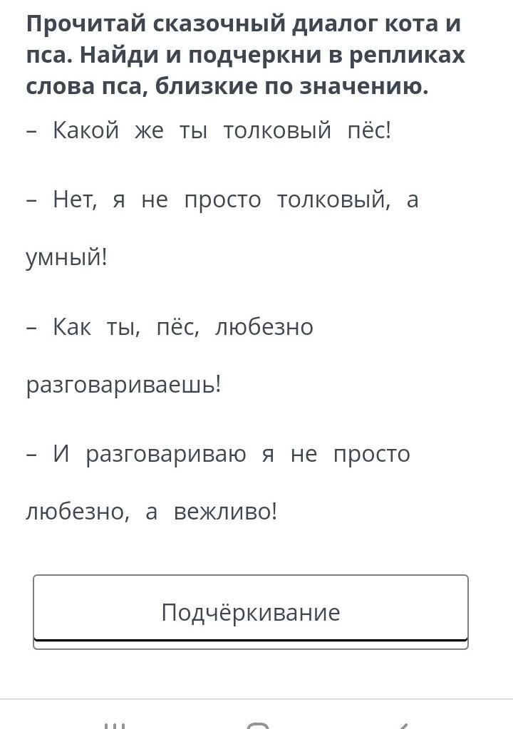 прочитай сказачный диалог кота и пса найди и подчеркни в репликах слова пса близкие по значению