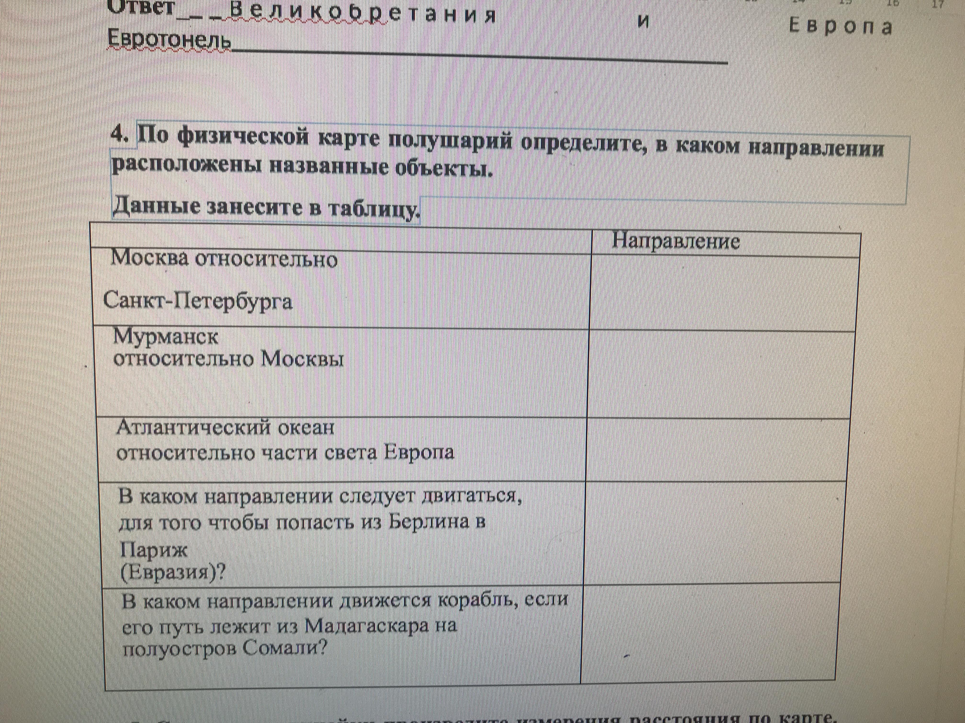 По физической карте полушарий определите в каком направлении расположены названые объекты данные занесите в таблицу