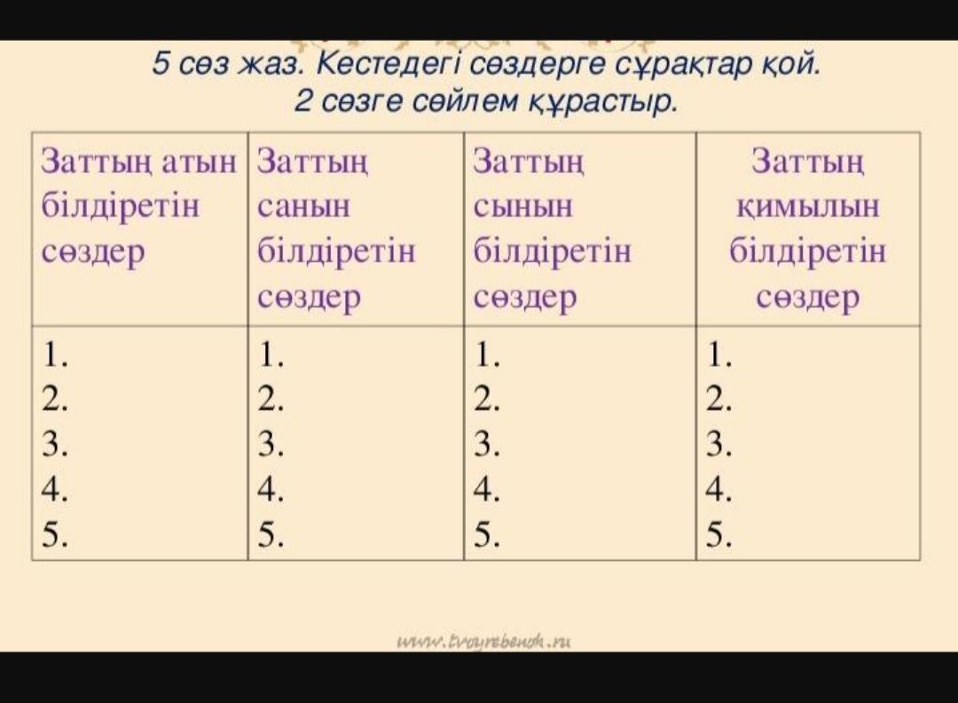 5 сөз жаз . Кестедегі сөздерге сұрақтар қой . 2 сөзге сөйлем құрастыр .