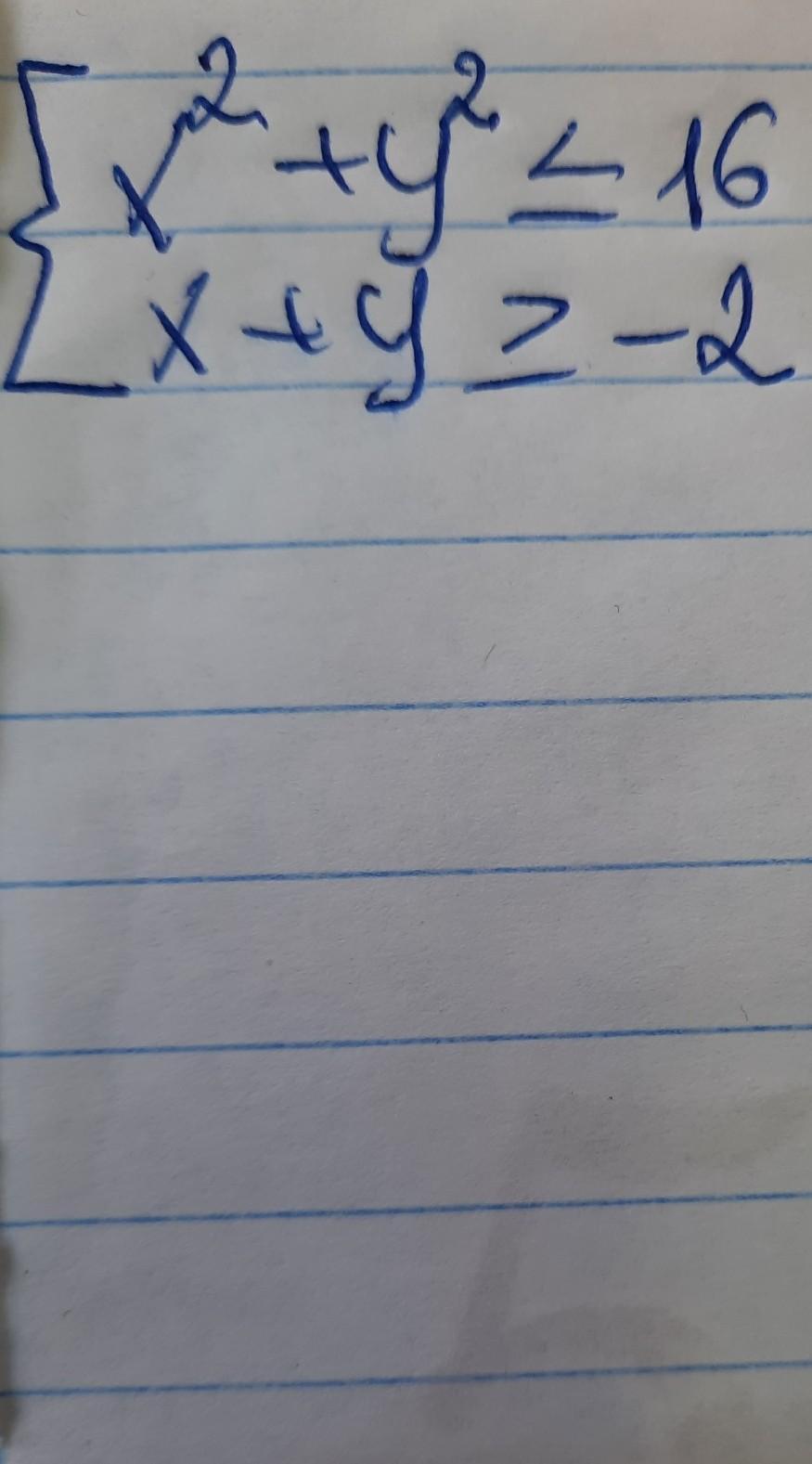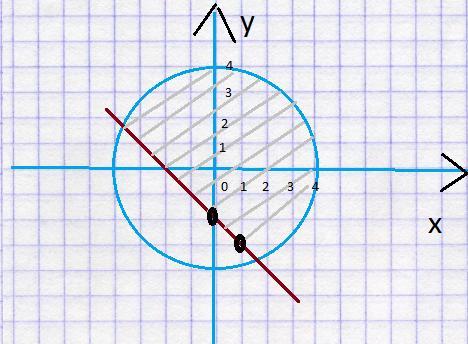 решение первого неравенства это множество точек на плоскости внутри и на окружности x²+y²=4² с центром в начале координат и радиусом 4