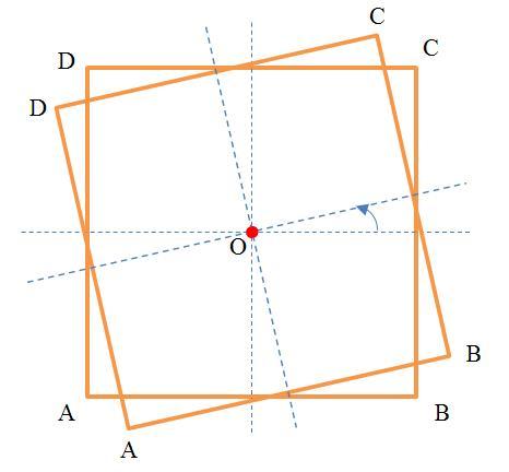 При повороте квадрата вокруг его центра симметрии О против часовой стрелки его образ первый раз совпадает с этим же квадратом, если, например, вершина B образа совпадает с вершиной C самого квадрата (см. рисунок). Тогда вершина C образа совпадает с вершиной D самого квадрата, вершина D образа совпадает с вершиной A самого квадрата, вершина A образа совпадает с вершиной B самого квадрата.