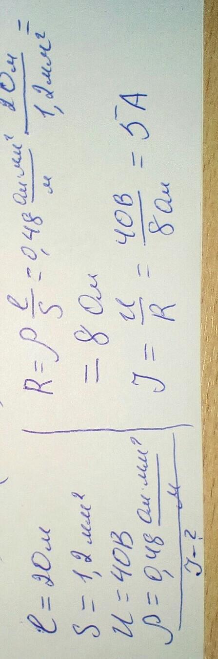 Определить силу тока на участке цепи, состоящем из константановой проволоки длиной 20м сечением 1,2мм, если напряжение на концах этого участка 40В. p=0,48 Om *мм2/м
