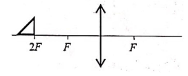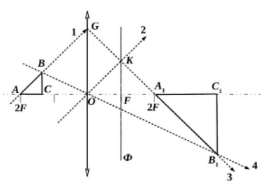 Треугольник располагают перед линзой так, что один из его катетов лежит на главной оптической оси линзы (см. рисунок). Расстояние между ближайшей точкой треугольника к линзе и центром самой линзы равно 2F . Треугольник считать равнобедренным и прямоугольным, а его площадь равной 50 см^2. Линзу считать тонкой собирающей, а ее фокусное расстояние равным 50 см. Постройте изображение данного треугольника и найдите площадь получившейся фигуры.