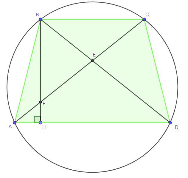 Решение: По теореме если вокруг трапеции можно описать окружность, то трапеция равнобедренна, следовательно трапеция ABCD - равнобедренная. Проведем высоту из точки B в точку H на основание AD. Пусть BH ∩ AC = F и AC ∩ BD = E. Рассмотрим прямоугольный треугольник ΔAED. Угол ∠EAD = ∠EDA, так как эти опираются на хорды СВ и AB соответственно, так как трапеция ABCD - равнобедренная, то AB = CD и углы опирающиеся на эти хорды, тоже равны. Так как треугольник ΔAED и равнобедренный, то по свойствам равнобедренного прямоугольного треугольника его углы 45°. По свойствам трапеции треугольник ΔAED подобен ΔBEC, следовательно углы этих треугольников равны и ∠EBC = ECB = 45°. Треугольник ΔAFH подобен треугольнику ΔBFC по двум углам, так как ∠AFH = ∠BFC как вертикальные углы, а ∠CAD = ∠ACB как внутренние разносторонние углы при параллельных прямых при секущей по теореме (AD║BC - по определению трапеции). Рассмотрим треугольник ΔBFC, так как ∠ECB = 45° и BH ⊥ BC по свойствам высоты трапеции, то треугольник ΔBFC - равнобедренный, тогда BF = BC. Так как треугольник ΔAFH подобен треугольнику ΔBFC, то треугольник ΔAFH - тоже равнобедренный и