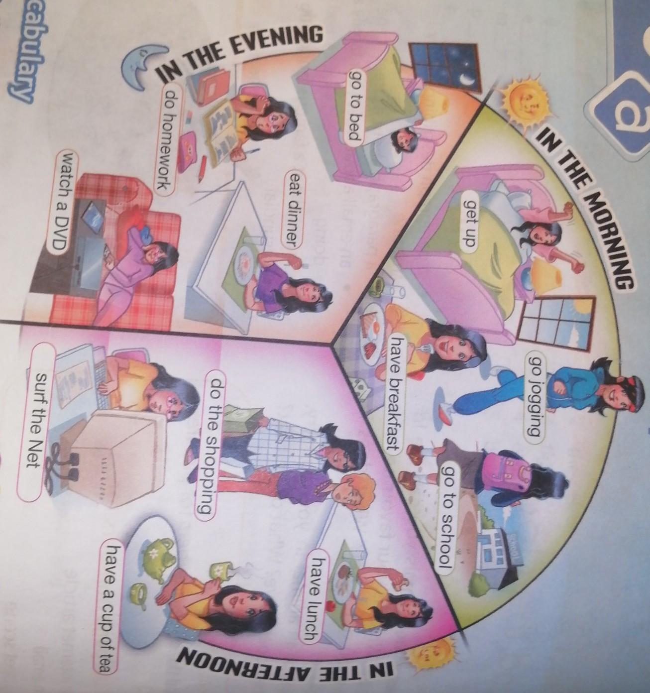 Ответ: In the morning Sally gets up ,have breakfast ,go jogging ,have breakfast, go to school. In the afternoon Sally go to the shopping ,have launch, have a cup of tea,surf the nest . In the evening Selly do homework,eat dinner,watch a DVD,go to bed