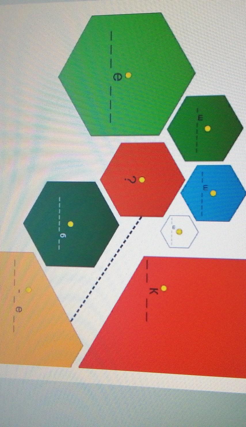 Определите, какой город отмечен знаком вопроса. Он является столицей своей страны (красный шестиугольник в центре). Разноцветными фигурами показаны соседние страны, соответствующие цвета присутствуют на их флагах. Размер многоугольников показывает соотношение площади территорий стран между собой. Зашифрованные слова - названия столиц этих стран. Пунктирная линия показывает, что граница между странами расположена в спорных территориях. *